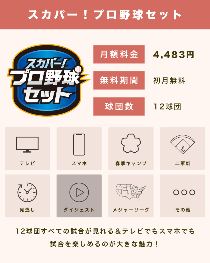 • 月額4,483円で、12球団の試合中継を幅広く視聴できる